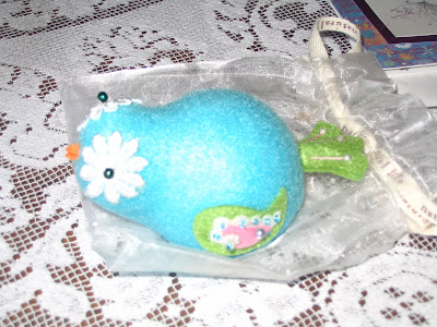 And last but surely NOT least of all of my goodies...is this sweet felt blue bird...Oh pictures just don't do this sweet bird justice, you really do need to see this in person...but wait, its more than that!!! It's a TAPE MEASURE!!! Yep it sure is...but you CANNOT have it its MINE!!! lol